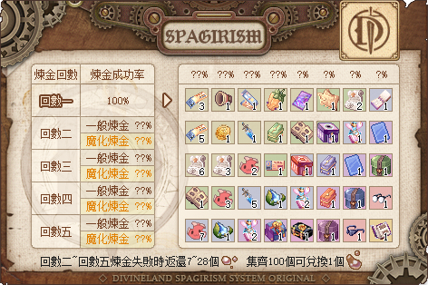 從第二回數開始,煉金成功率非100%並逐步下降,若挑戰失敗,則僅返還若干个黏土顆粒