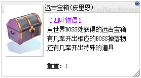 同时可额外开到一些其他道具和Zeny,低几率获得稀有道具 - 远古参与宝箱仅可开到一些普通道具与少量Zeny,无法开到稀有道具与MVP掉落物