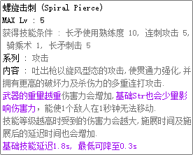 - 螺旋击刺:增加(基础str/5)%的伤害,全局伤害+10%,基础技能延迟1.8s, 最低可降至0.3s